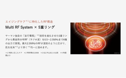 ヤーマン独自の「並行電極」*2技術を進化させた5重リングから黄金熱分布RF(ラジオ波)を0.5~2.5MHzまで6種の出力で実現。最大2.5MHzのRFが波紋のように広がり、肌を従来*3より深く*4均一に温めます。
