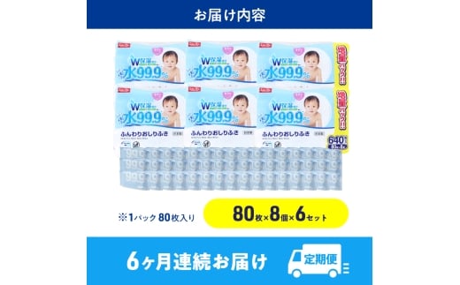 7. 水99.9% ふんわりおしりふき(80枚×8P)×6セット 計288個 定期便 6ヶ月 6回 おしりふき シート お尻ふき 新生児 赤ちゃん ベビー 日本製 さらさら 水に近い まとめ買い 裾野市 静岡県 [№5812-0820]