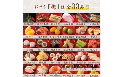 笹巻麩柚子餡入り/田作り奉書/敲き牛蒡/紅白蒲鉾/鰆柚庵焼/子持ち鮎甘露煮/数の子/海老艶煮/杏子さわやか煮/翡翠梅甘露煮/甘海老糀漬/伊達巻/花餅梅/鶏八幡巻/鰊昆布巻/筍土佐煮/蕗青煮/梅人参/松笠慈姑白煮/錦紙巻/梅小川巻/蓮根旨煮/海老団子/若鶏柚子胡椒焼/合鴨ワイン煮/紅白膾/いくら醤油漬/音羽透かし昆布/クランベリー胡桃/黒豆蜜煮/紅白千代呂木/練り金団/栗甘露煮