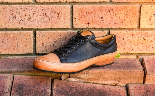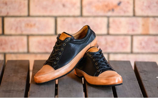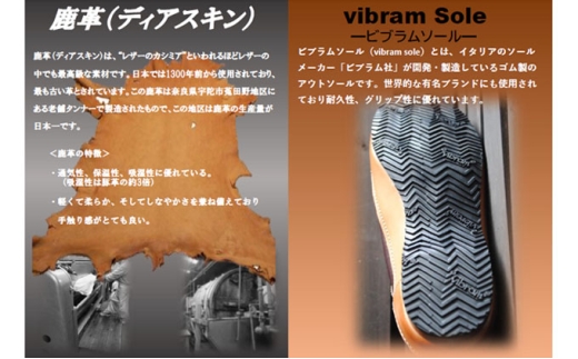 ソールは高性能なビブラムソールでアッパーは吸湿性、通気性が良くとても柔らかな鹿革を使用し、履き心地とデザイン性を兼ね備えたハイクオリテイーなタウンカジュアルシューズ。しかも鹿革は奈良県宇陀市で鞣されたものを使用し、製造は奈良県大和郡山市というメードイン奈良の逸品。サイズの目安はスニーカーのサイズから0.5cm~1cm下、革靴のサイズからは表示サイズ相応。ワイズは3E相当。