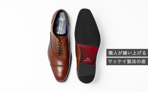 アンティーク仕上げを施し、マッケイ製法で作られた奈良県大和郡山産の価値あるビシネスシューズ。(※ブラックはアンティーク仕上げではございません)アンティーク仕上げをする事で適度なムラ感を出し、独特の風合いが出る。またマッケイ製法(底とアッパーを直接縫い付ける製法)で作られており、屈曲性がよく足馴染みが良いのが特徴です。大和の職人の技術が詰まった手の込んだ逸品。シャープな見た目なのに甲回りがゆったりしているのが特徴。