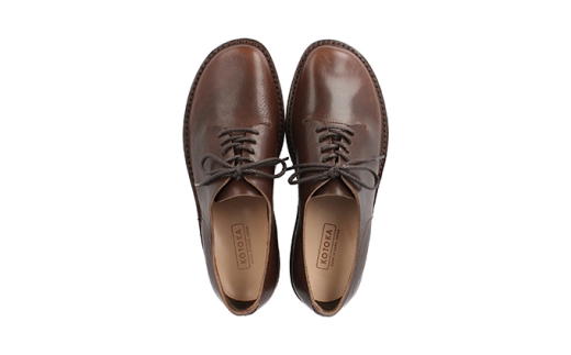 奈良県大和郡山市は日本有数の革靴の産地。この地で昔からひたむきに革靴作りに向き合ってきた靴メーカー7社が共同開発した革靴「KOTOKA」はシンプルで履きやすいデザインが特徴。甲革に日本を代表する国産革栃木レザーのヌメ革を使用し、天然皮革独特のシボやシワなど自然な風合いとヌメ革特有の経年変化による味わいが楽しめる。本底にビブラムソールを使用しステッチダウン製法でとても軽量。