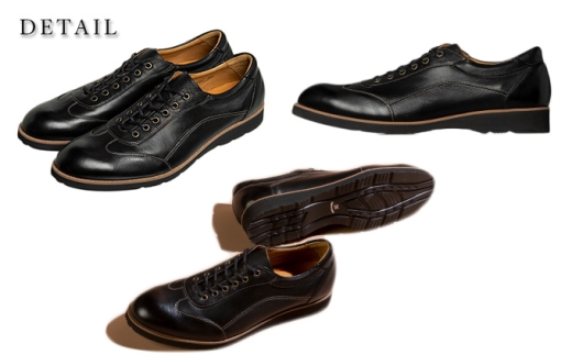 表革と中敷きに吸湿性、通気性が良くとても柔らかな鹿革を使用し足当たりがとてもソフトな履き心地。片足約290g(25.5cm片足基準)でとても軽量。鹿革は奈良県宇陀市で鞣されたものを使用し、製造は奈良県大和郡山市というメードイン奈良の逸品。見た目はスリムだがゆったりとした足入れ感が特徴。片足約290g(25.5cm片足基準)でとても軽量。サイズの目安はスニーカーのサイズから0.5cm~1cm下、革靴のサイズからは表示サイズ相応か0.5cm下。ワイズは3E相当。サイズ感はやや大きめ。