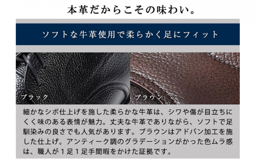上品なシボ仕上げの牛革を使い、つま先までゆったりな丸いトゥデザイン。