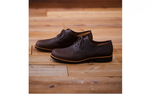 ダービーと呼ばれる外羽根式デザインの靴を、人の足形に近づけたオブリーク木型でつくった靴です。足指あたりの幅があり、甲周りにゆとりを持たせたこの木型で幅広の足の方でも履き易い靴に仕上がりました。 蝋(ワックス)を染み込ませ、揉み仕上げした革をライニング(裏張り)をせずに使っています。履き込むと柔らかく馴染み、シワや色の濃淡が生まれ、風合いが増します。