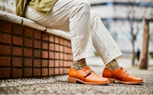 甲の上のストラップでフィットさせる、モンクストラップと呼ばれるタイプの靴を、つま先からカカトまで続く一枚の革で作りました。 オイルをたっぷり含んだ栃木レザーは履き始めるとすぐ足に馴染みます。 足の形に近いつま先の形を持つオブリーク木型を使った、やや幅広で甲にもゆとりのある靴です。