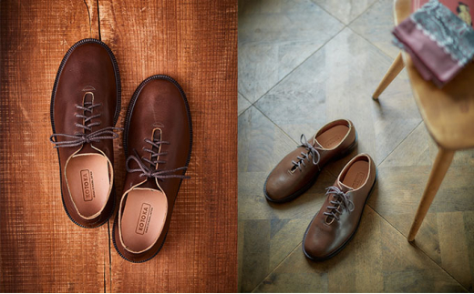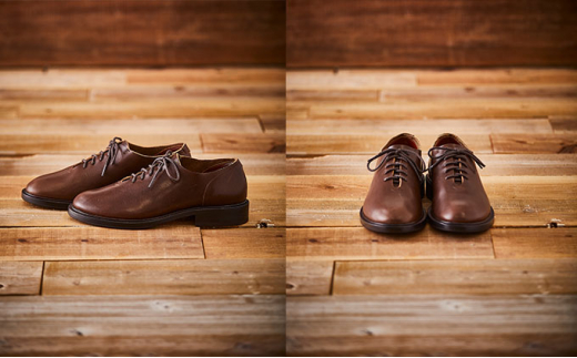 つま先から踵までを一枚の革でつくるホールカットタイプの靴。 厚手ながら柔らかな栃木レザーを、敢えてライニング(裏張り)を使わず一枚革で使っています。この造りが、革が優しく足を包む履き心地の秘訣です。 程よく丸いつま先のラウンド木型を使用。カジュアル且つ洗練されたスタイルの靴に仕上げました。