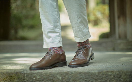 つま先から踵までを一枚の革でつくるホールカットタイプの靴。 厚手ながら柔らかな栃木レザーを、敢えてライニング(裏張り)を使わず一枚革で使っています。この造りが、革が優しく足を包む履き心地の秘訣です。 程よく丸いつま先のラウンド木型を使用。カジュアル且つ洗練されたスタイルの靴に仕上げました。