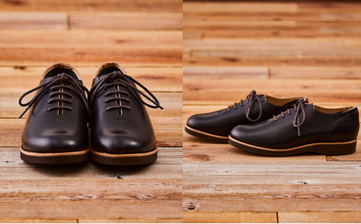 つま先からカカトまでを一枚の革でつくるホールカットタイプの靴。センターに長めに配した靴紐が個性的なデザインです。 厚手の、しかし柔らかなレザーを、敢えてライニング(裏張り)を使わず一枚革で使っています。このつくりが、革がやさしく足を包む履き心地の秘訣です。 ほどよく丸いつま先のラウンド木型を使用。カジュアルながら、洗練されたスタイルの靴に仕上がりました。