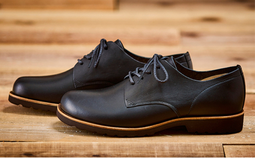 ダービーと呼ばれる外羽根式デザインの靴を、人の足形に近づけたオブリーク木型でつくった靴です。足指あたりの幅があり、甲周りにゆとりを持たせたこの木型で幅広の足の方でも履き易い靴に仕上がりました。 蝋(ワックス)を染み込ませ、揉み仕上げした革をライニング(裏張り)をせずに使っています。履き込むと柔らかく馴染み、シワや色の濃淡が生まれ、風合いが増します。
