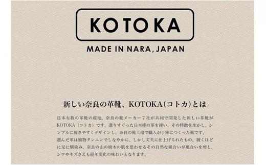 奈良県大和郡山市は日本有数の革靴の産地。この地で昔からひたむきに革靴作りに向き合ってきた靴メーカー7社が共同開発した革靴「KOTOKA」はシンプルで履きやすいデザインが特徴。甲革には鎌倉時代に遡る歴史を持つ日本最大の革の産地、兵庫県たつの市の中で、特に丁寧な加工で評価の高いタンナー「マルヒラ」で、植物タンニンで二次なめしされた革を使用。製造過程で通常2回使用するドラムを、『なめし、染め、蝋引き、揉み』の計4回使用し、手間をかけてつくられた革です。色ムラやシワが、履くほどに深い味わいを醸し出します。古都ラインの靴はこの革の風合いを生かした、シンプルで履きやすく、飽きのこないデザインの靴です。