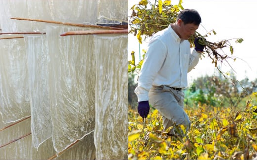豆腐伝来の地と云われる奈良に、戦前から伝わる幻の大豆「大鉄砲」。その名の通り「大きな粒」と「甘み」が特徴の奈良県在来大豆です。地元農家の鎌田ファームさんと私たち豆腐屋で種を探し、一緒に種を蒔き復活させた貴重な大豆です。2020年2月に奈良県で守るという意味を込めて「大和大鉄砲」という名称で商標登録を致しました。「こんなおいしい大豆を豆腐だけに使うのはもったいない」私たち三木食品のそんな想いから醤油、味噌、きな粉、そしてこの「大鉄砲湯葉」が生まれました。しぼりたての新鮮な大鉄砲豆乳を木枠で囲った大きな平鍋に入れ、じっくり弱火で加熱する。ゆっくりゆっくりとできる美しい膜、これこそが「大鉄砲湯葉」です。製造元であるゆば喜本舗では、この「膜」を一枚一枚手作業で長い割竹を使い静かに引き上げ、水切りをし乾燥させるといった伝統的な製法を今も守り続けています。大和大鉄砲大豆の甘みそして旨み、更には栄養素が凝縮された上品で贅沢な一枚をどうぞご賞味ください。