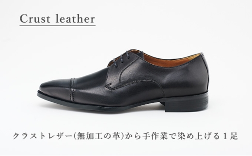 『ナローなフォルムの日本製ドレスシューズ』奈良県大和郡山製のドレスシューズ。程よい光沢感で厚みのある牛革を使用しています。またマッケイ製法という底面と中底面を縫い上げる伝統製法を採用しているため、屈曲性、耐久性があり軽量です。中底前足部には柔らかいクッションが入っていて履き心地にもこだわっています。デザインは外羽レースアップタイプ。サイズの目安はスニーカーのサイズから0.5cm~1cm下、革靴のサイズからは表示サイズ相応。ワイズは2E相当(細身)。 着用時はビジネス用の薄手の靴下を着用ください。