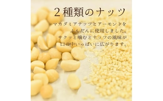 ナッツクッキー(小麦粉(国産),バター,マカダミアナッツ,砂糖,アーモンドダイス,卵白(卵を含む),卵黄,コアントロー(オレンジを含む)),