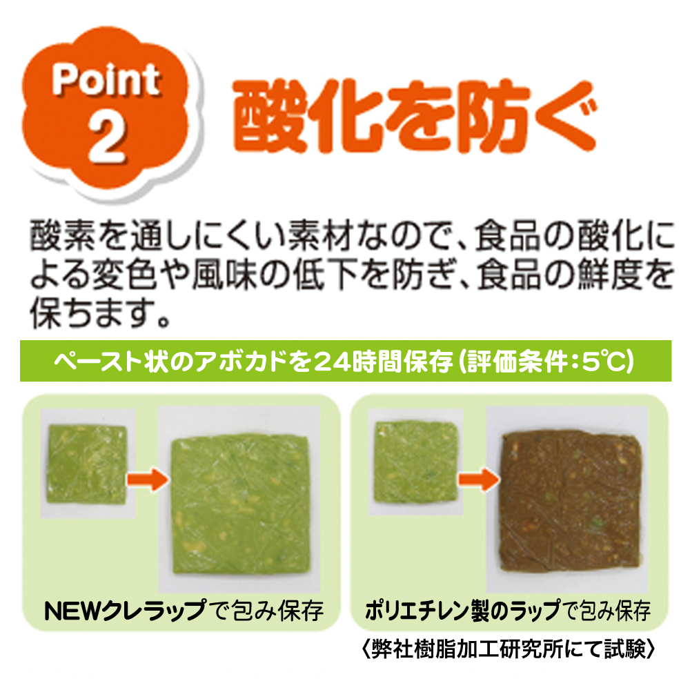 NEWクレラップはポリ塩化ビニリデン製だから、水蒸気や酸素を通しにくく、ラップした食品のみずみずしさや鮮度を保ち、においうつりも抑えます。