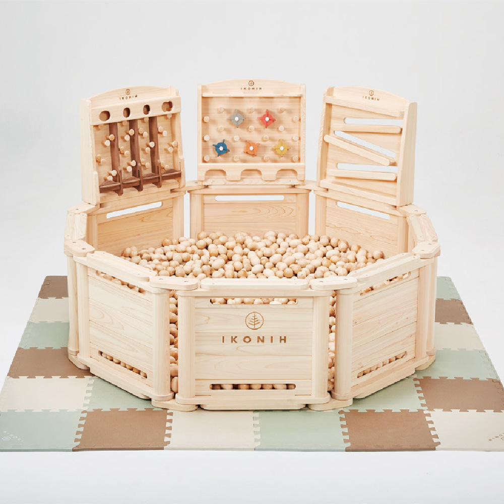 2020年ウッドデザイン賞受賞。組み立て式のボールプール。【あんしん設計】使用されている檜は子供たちが安心して遊べるように角を取り、丸みを持たせたデザインにしています。3種類の木球はすべて子供達の手に収まりやすいサイズにして、手触りを心おきなく感じることができます。【全身で遊んで、木を知る】子供一人ひとりの個性に合わせた遊び方ができます。フェンスに木球を並べたり、寝転がって木球の楽しい感触を全身で感じたり、木球は同じ形でも色味や木目が一つずつ異なるため、宝探しゲームもできます。IKONIHプールで「木」そのものに全身で触れる経験が、子供達の心を豊かにする木育に繋がります。【オプションフェンス3種】・スロープ・ピンボール・ダム、プールフェンスの上部にゲームボードとなるオプションフェンスを設置することができます。中の木球を使ってゲーム感覚で楽しく遊べます。