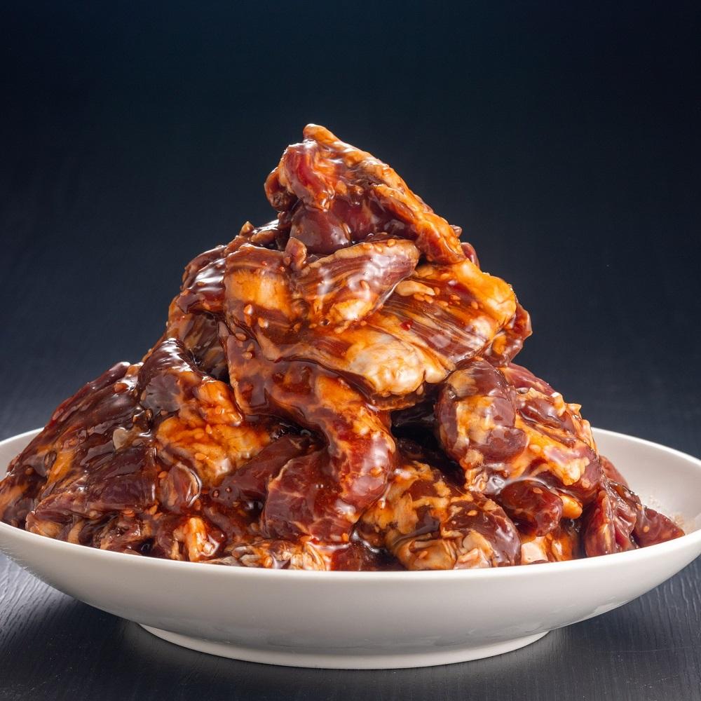 牛ハラミ(オーストラリア)、砂糖、しょうゆ、果糖ぶどう糖液糖、たん白加水分解物、ごま、食塩、ガーリックペースト、ねぎ、りんごピューレ、豆板醤、生姜、香辛料、植物油脂/糊料(加工澱粉、キサンタン)、調味料(アミノ酸等)、着色料(紅麹、カロチノイド)、酸化防止剤(V.C)、酸味料、甘味料(甘草)、(一部に小麦・牛肉・ごま・大豆・りんごを含む)