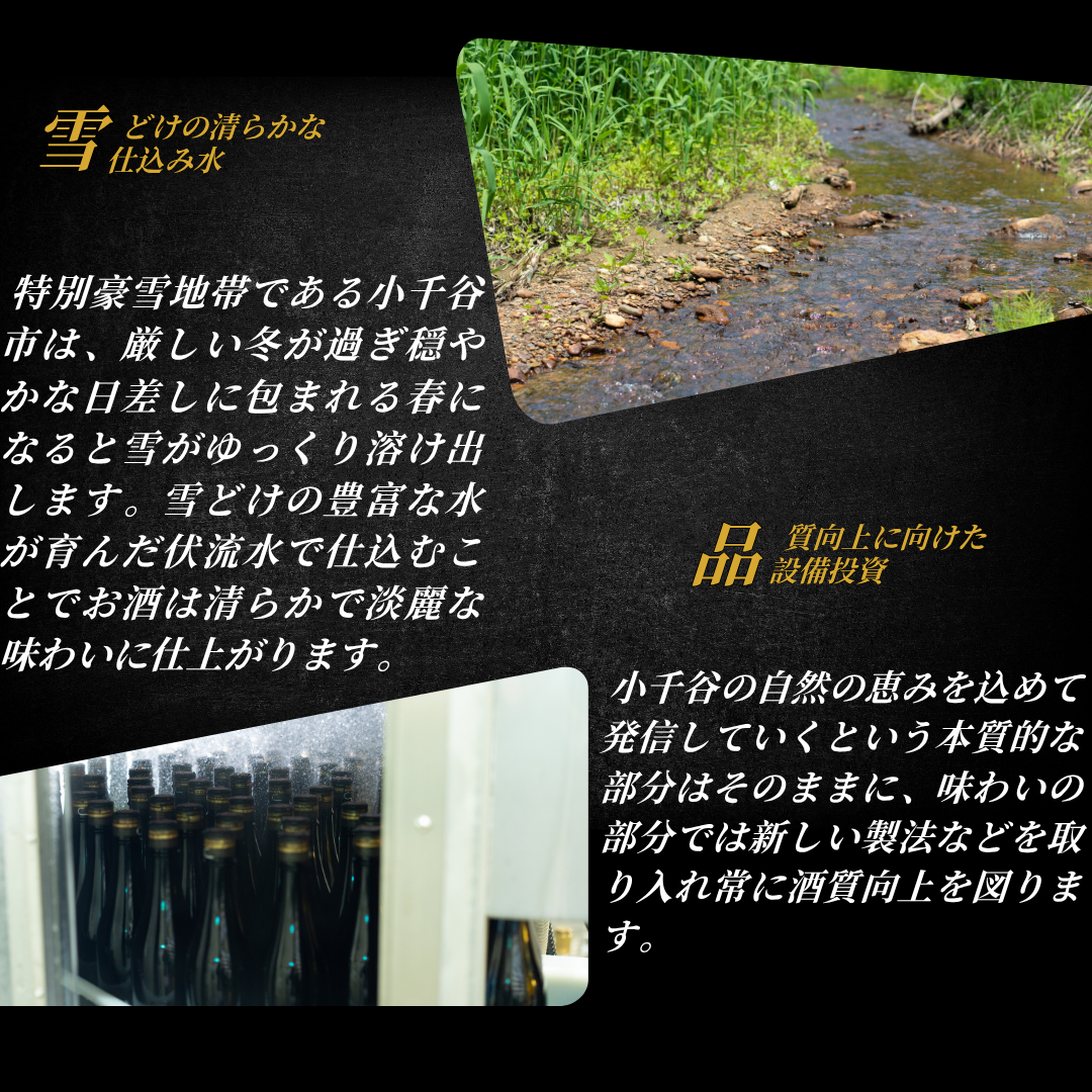 小千谷の棚田で育てた酒米「越淡麗」を使い、水は小千谷の西山山系から湧き出る名水、杜氏・蔵人は小千谷の職人、蔵元は小千谷の高の井酒造と、全てにおいて小千谷で作り上げられたお酒です。
