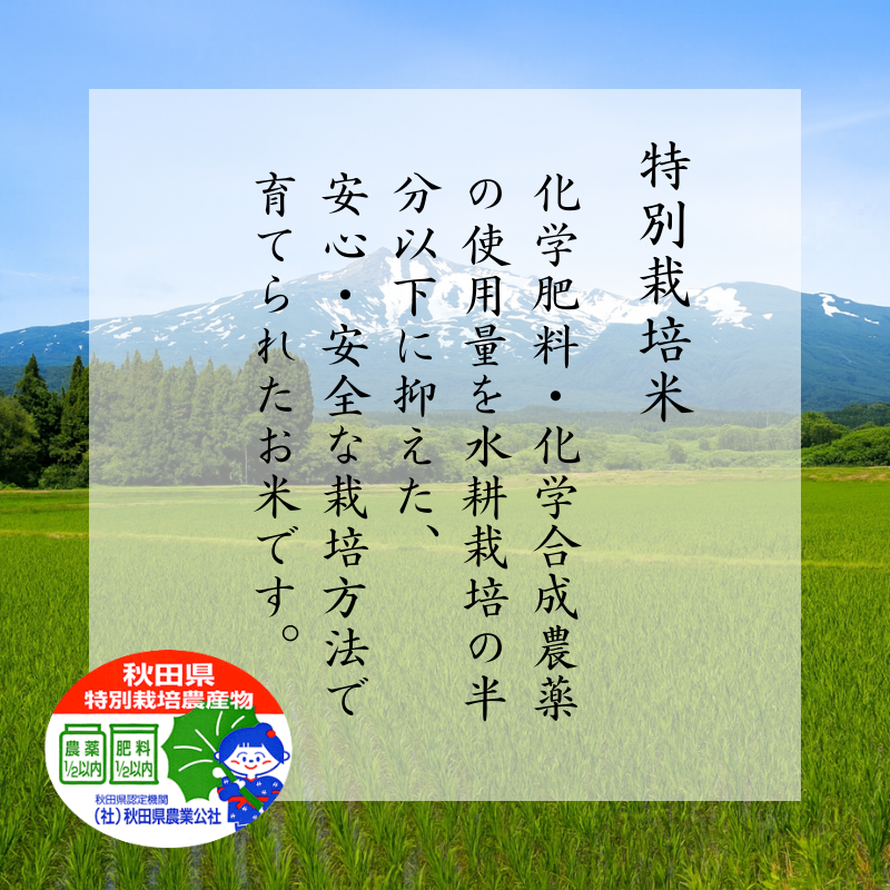 秋田県特別栽培農産物は、堆肥等の有機質肥料による土づくりが行われている「ほ場」において、化学合成された農薬・肥料を県内の平均的な栽培方法の半分以下に抑えて作られた「人」「環境」にやさしい農産物です。