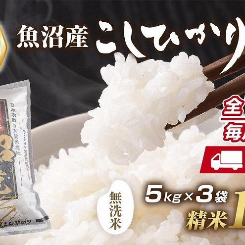 【定期便】|無洗米| 新潟県 魚沼産 コシヒカリ お米 15kg×計12回 精米済み 年間 毎月発送 こしひかり(お米の美味しい炊き方ガイド付き) ご飯 ブランド米 銘柄米