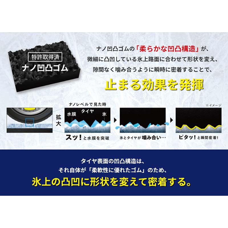 決め手はタイヤ表面の凹凸構造!氷上の凸凹とタイヤ表面の凹凸が、がっちり噛み合う。