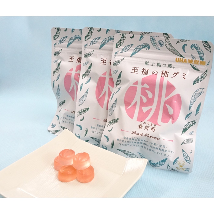 UHA味覚糖(株)と桑折町との共同開発。桑折町産の桃「あかつき」のジューシーな味わいが楽しめるキャンディとグミに仕上げました。