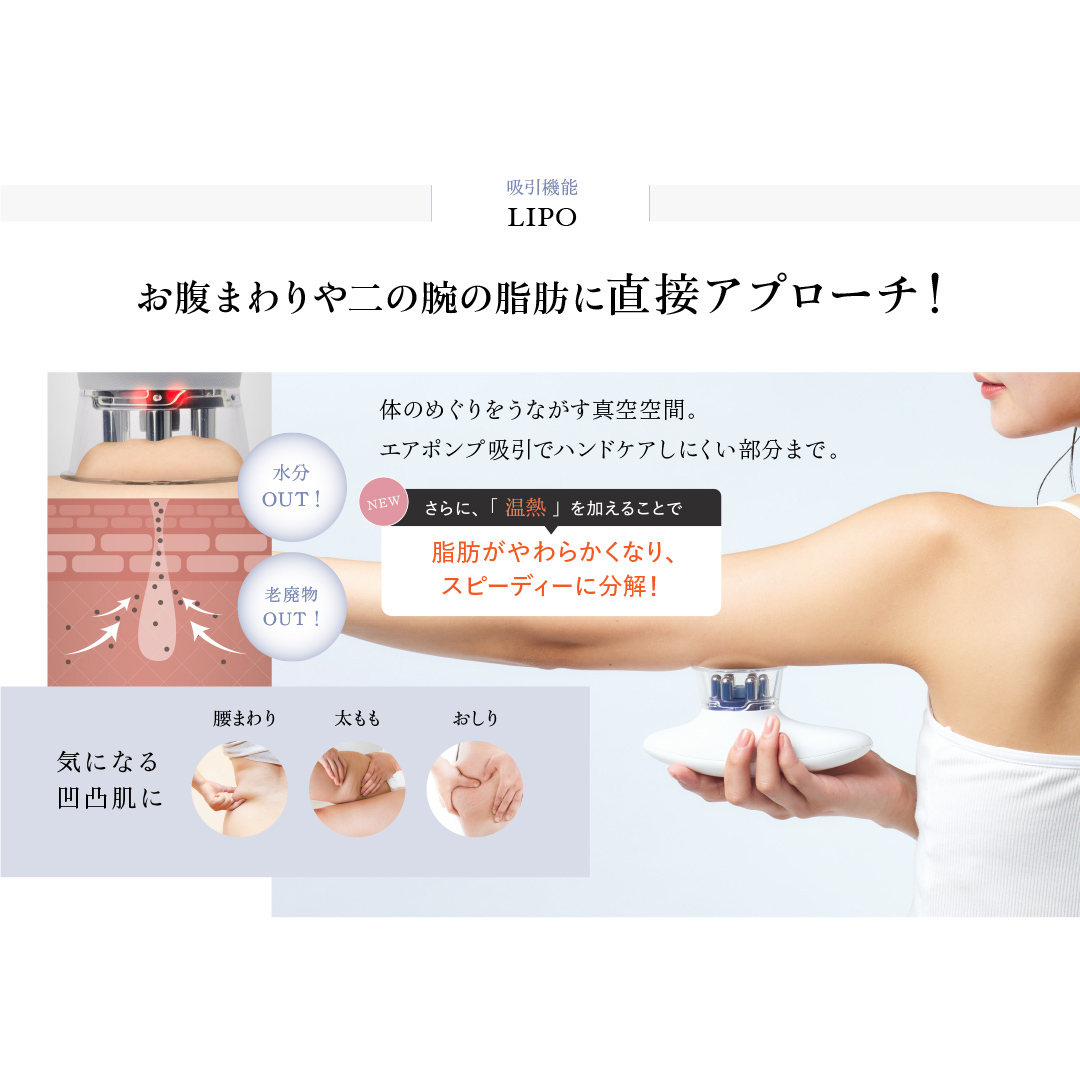 ボディモード:LIPO(吸引)+EMS(引き締めケア)+LED(美容ケア)+温熱
