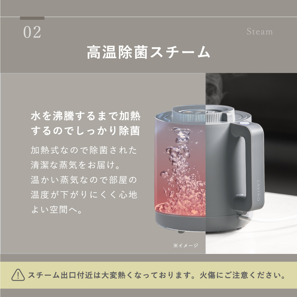 水が高温殺菌されているため、清潔な蒸気で加湿できるのが魅力。