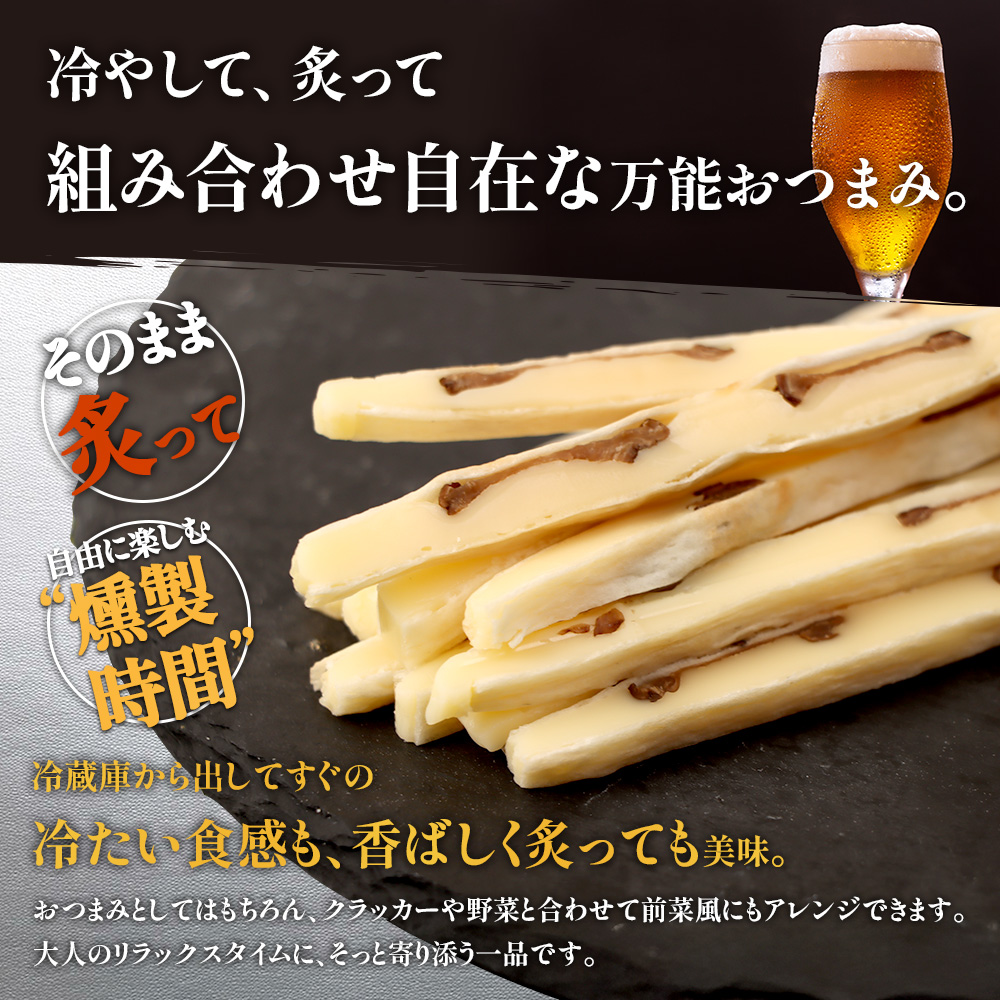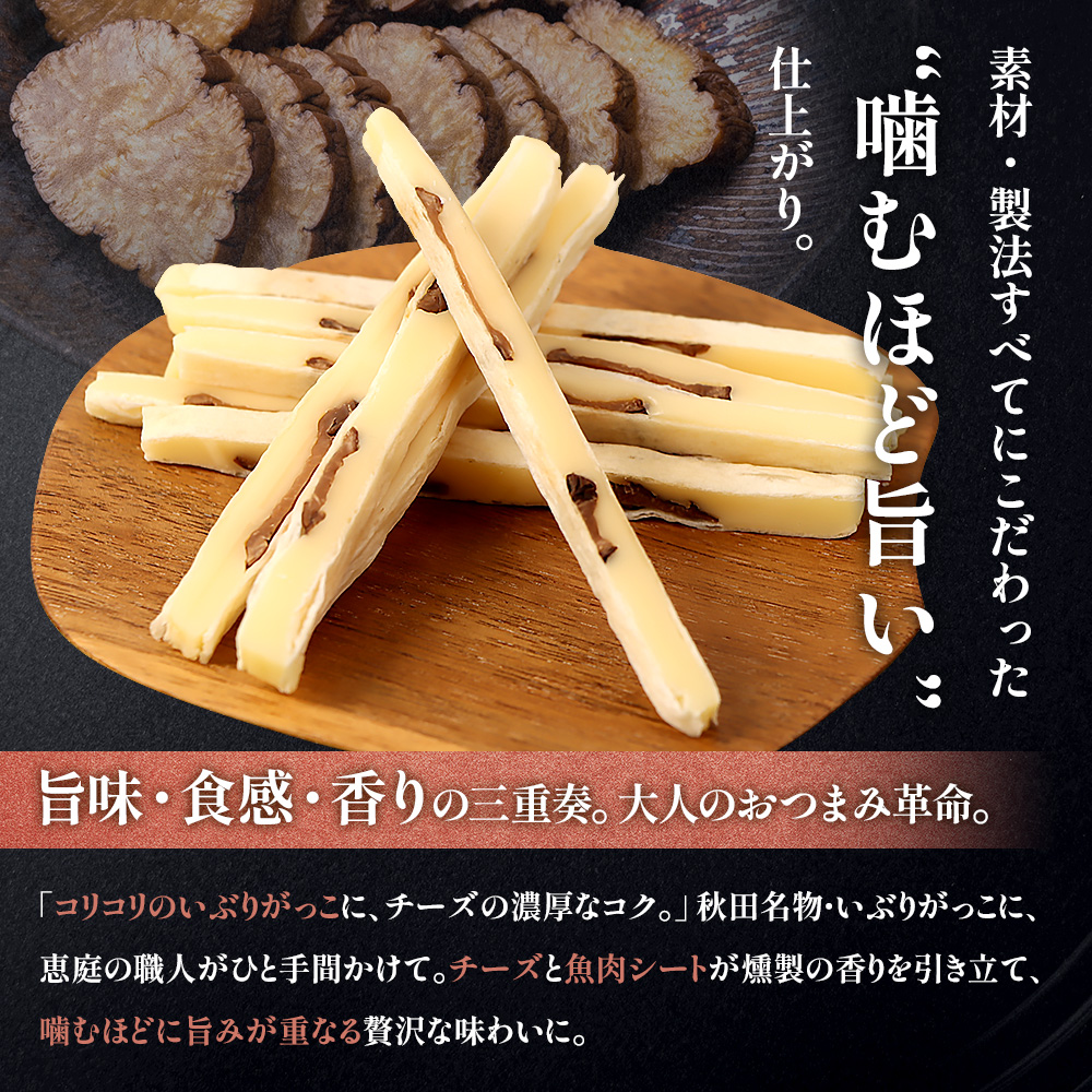 秋田県産のいぶりがっこチーズをチーズと魚肉シートでサンドしました。コクのあるチーズと、いぶりがっこの塩味、食感、燻製感が相性抜群です。