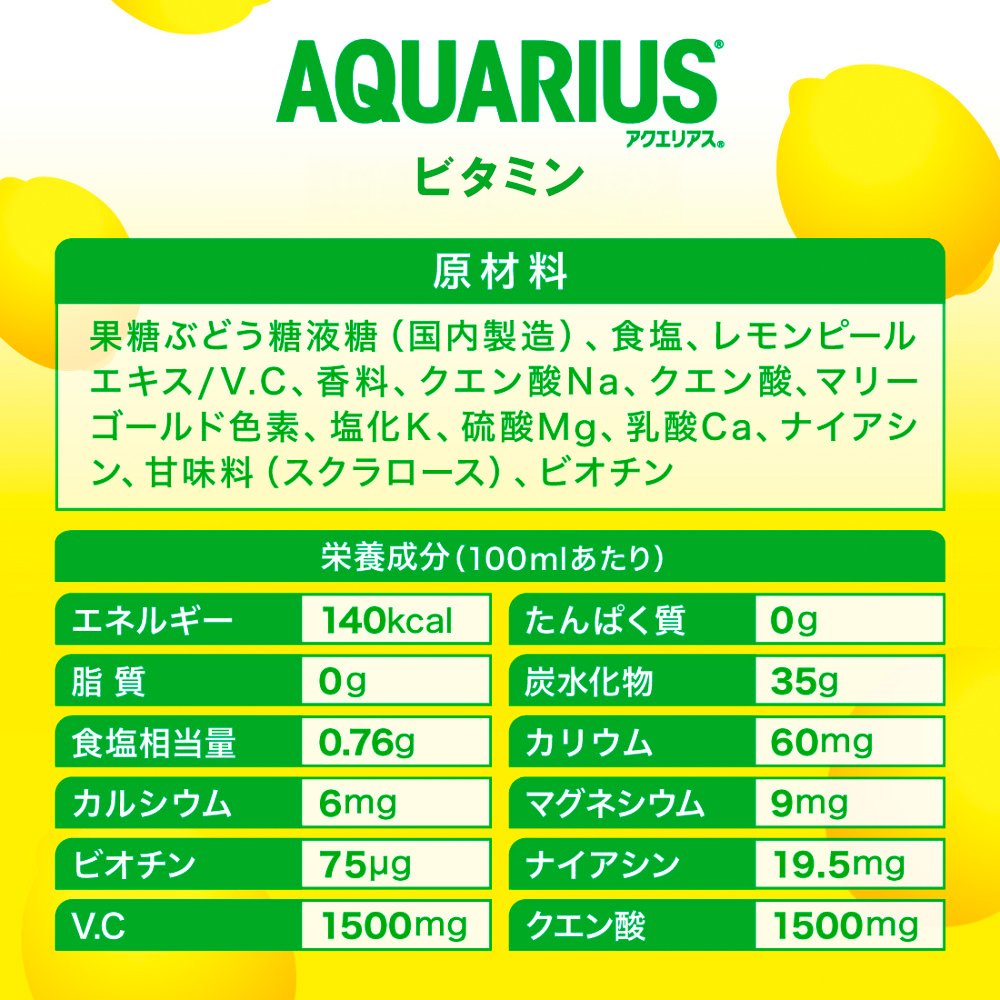 果糖ぶどう糖液糖(国内製造)、食塩、レモンピールエキス/ V.C、香料、クエン酸Na、クエン酸、マリーゴールド色素、塩化K、硫酸Mg、乳酸Ca、ナイアシン、甘味料(スクラロース)、ビオチン