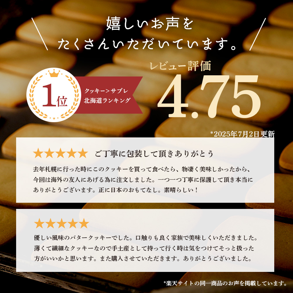 北海道産の小麦粉とバターに、たっぷりとミルクを使った贅沢な配合のミルククッキーです。北海道産の原材料にこだわり、じっくりと生地を寝かせて焼き上げる手間をかけた製法で作っています。