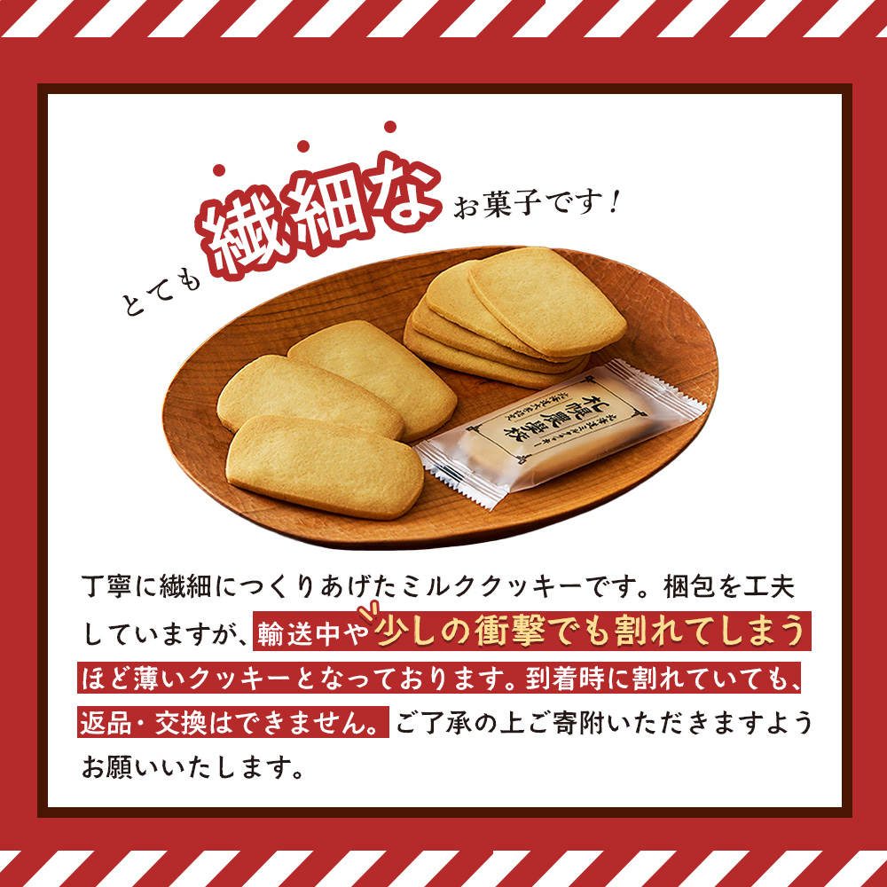 北海道産の小麦粉とバターに、たっぷりとミルクを使った贅沢な配合のミルククッキーです。北海道産の原材料にこだわり、じっくりと生地を寝かせて焼き上げる手間をかけた製法で作っています。