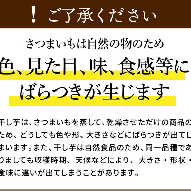 ※干し芋は自然食品の為、同一品種でも収穫時期、天候等により、大きさ、形、硬さ等に違いが出てしまう事があります。