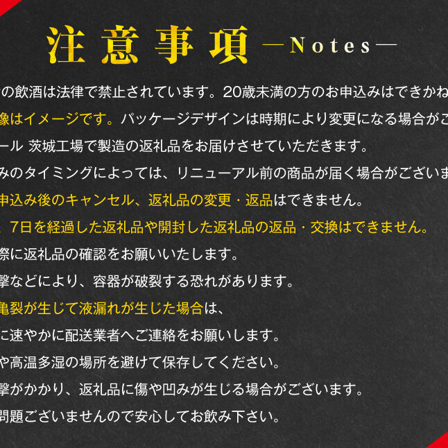 ・外箱に衝撃がかかり、返礼品に傷や凹みが生じる場合がございます。品質には問題ございませんので安心してお飲み下さい。