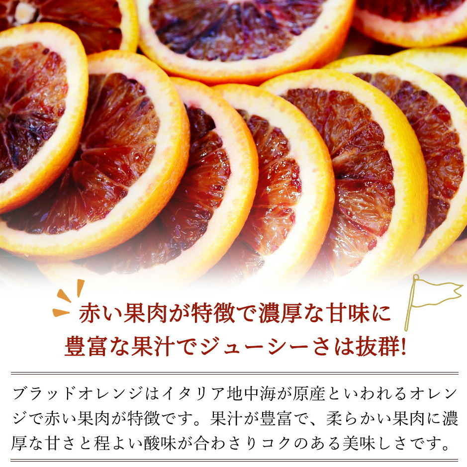 ブラッドオレンジはイタリア地中海が原産といわれるオレンジで赤い果肉が特徴です。果汁が豊富で、柔らかい果肉に濃厚な甘さと程よい酸味があわさりコクのある美味しさです。生食はもちろんのことジュース等にするとても美味しくお召し上がりいただけます。