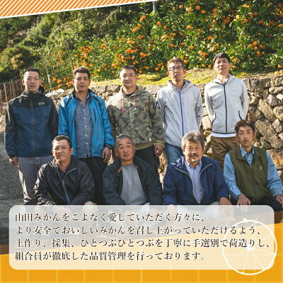 また、山田みかんをこよなく愛していただく方々に、より安全でおいしいみかんを召し上がっていただけるよう、土作り、採集、ひとつぶひとつぶを丁寧に手選別で荷造りし、組合員が徹底した品質管理を行っております。