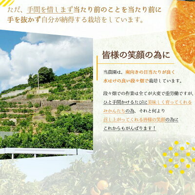 段々畑での作業は全てが大変で重労働ですが、ひと手間かけるたびに美味しく育ってくれるみかんたちの為、それと何より召し上がってくれる皆様の笑顔の為にこれからもがんばります!