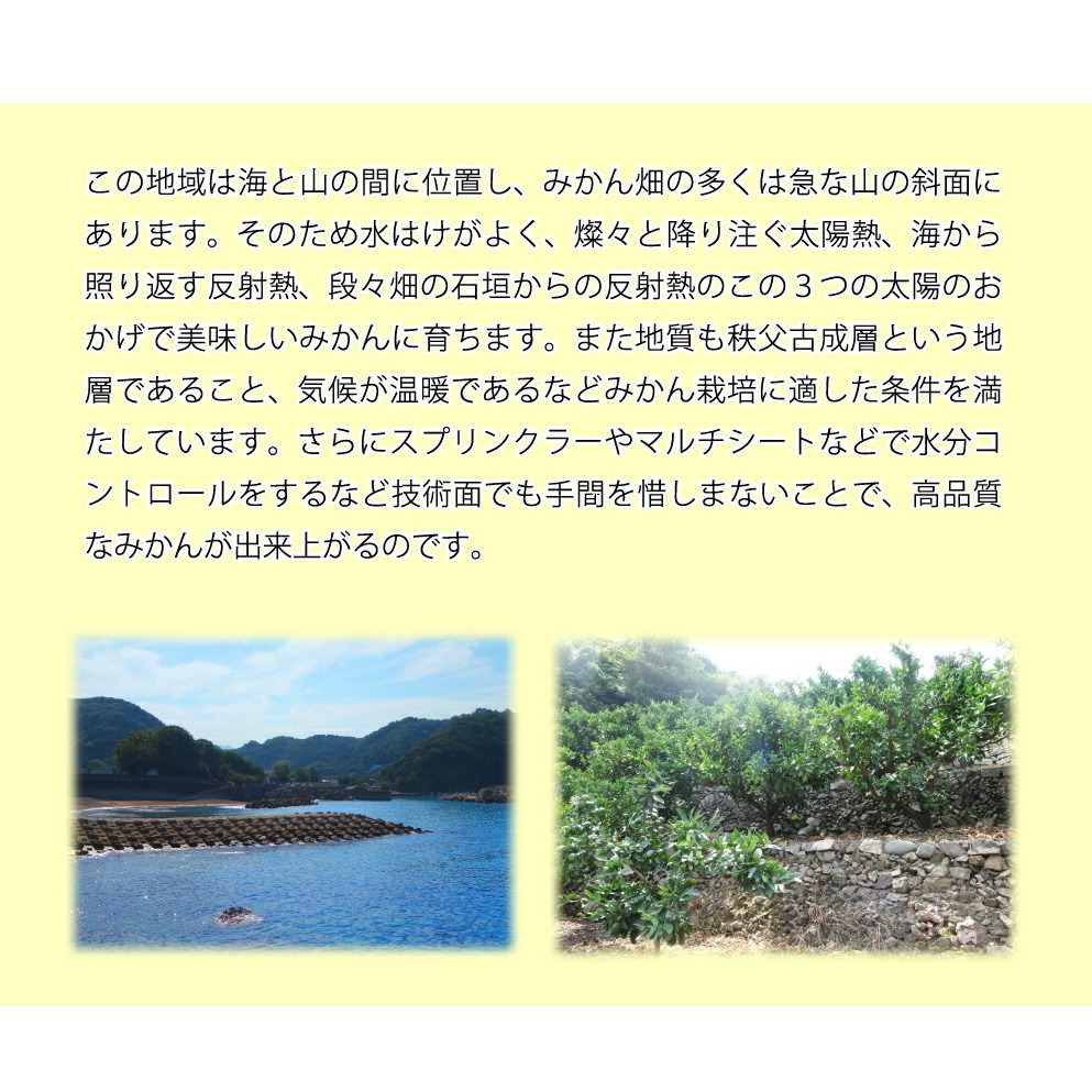 また地質も秩父古成層という地層であること、気候が温暖であるなどみかん栽培に適した条件を満たしています。