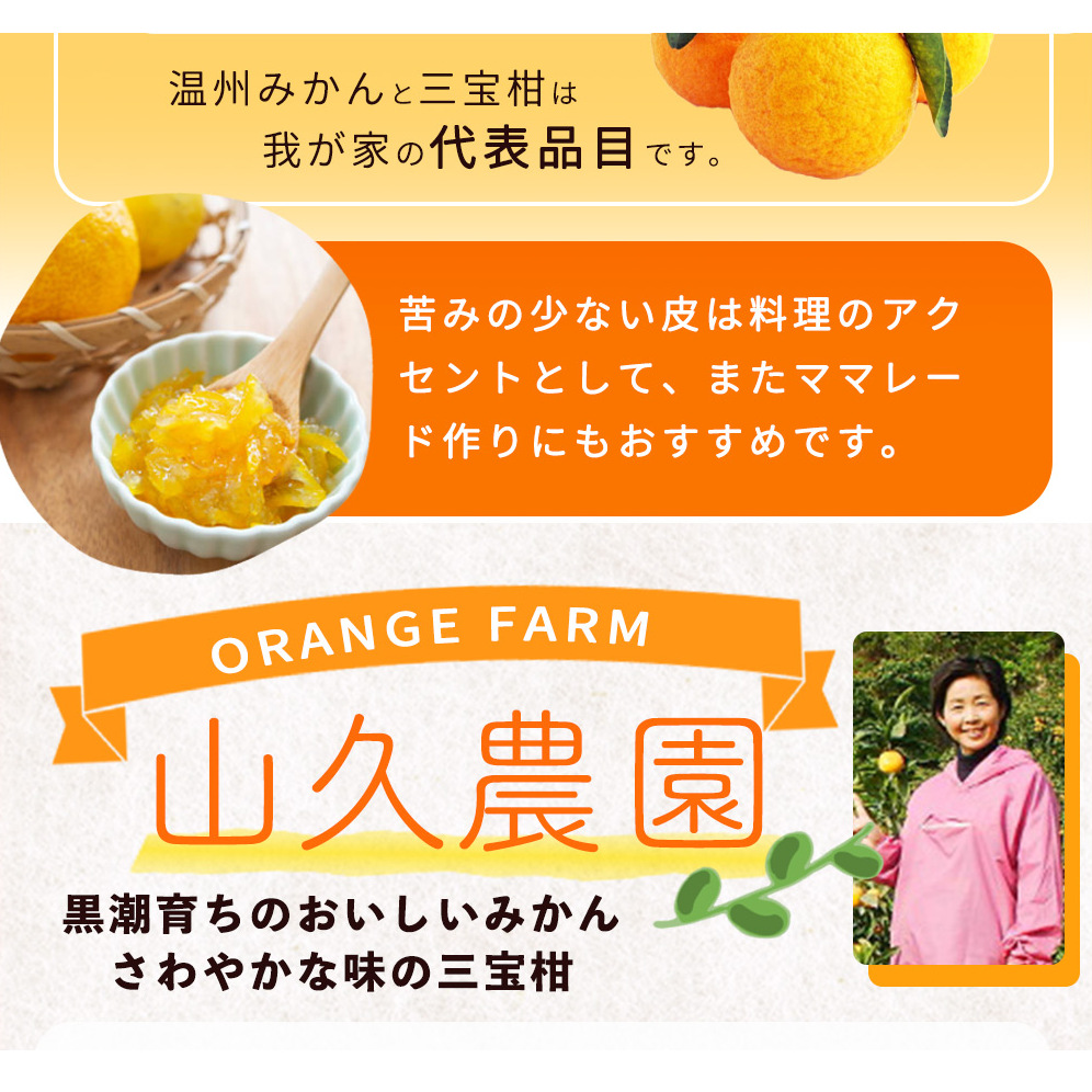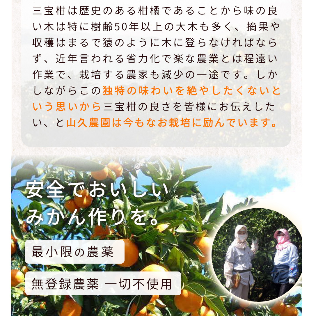三宝柑は歴史のある柑橘であることから味の良い木は特に樹齢50年以上の大木も多く、摘果や収穫はまるで猿のように木に登らなければならず、近年言われる省力化で楽な農業とは程遠い作業で、栽培する農家も減少の一途です。しかしながらこの独特の味わいを絶やしたくないという思いから三宝柑の良さを皆様にお伝えしたい、と山久農園は今もなお栽培に励んでいます。