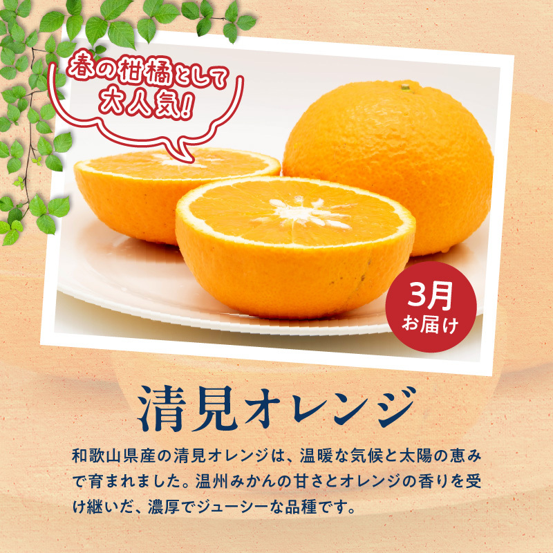 和歌山県は全国有数の柑橘生産地。温暖な気候と太陽の恵みが、濃厚でジューシーな果汁たっぷりの清見オレンジを育てました!春の柑橘として人気が高い品種で、温州みかんの甘みとオレンジの香りを受け継いだ魅力あふれるフルーツです。