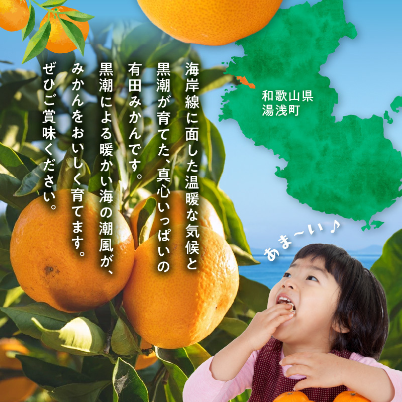 海岸線に面した温暖な気候と黒潮が育てた真心いっぱい有田みかんです。12月初旬までは早生、その後中生、晩生となります。