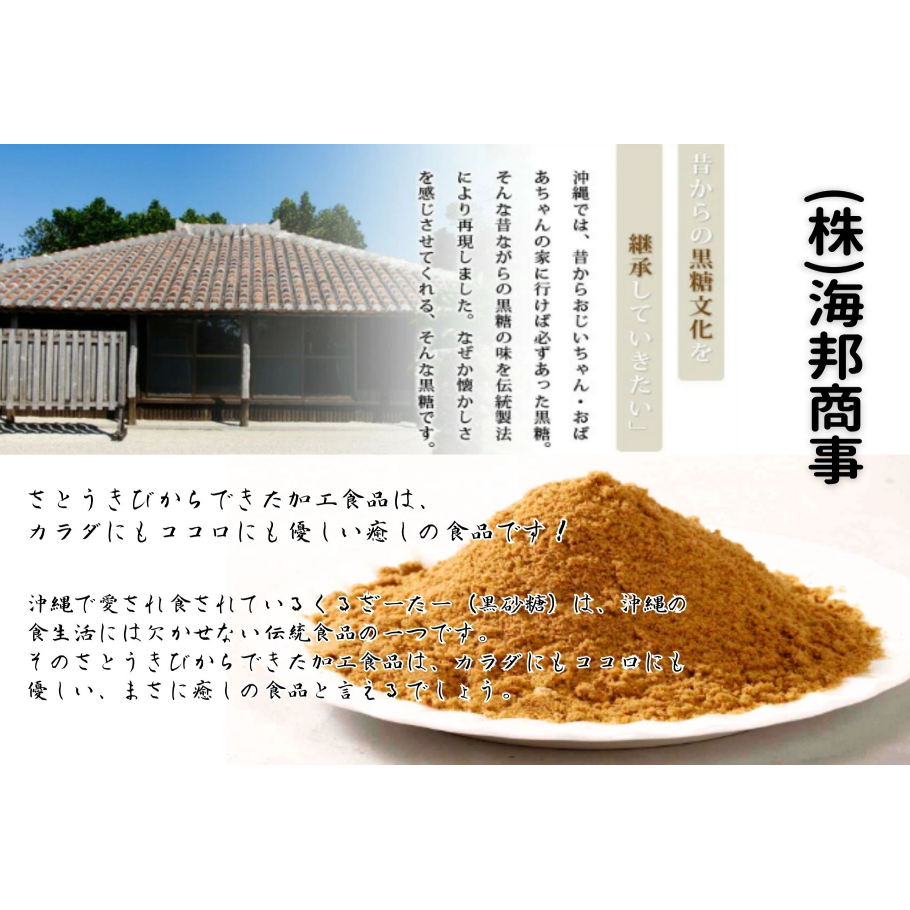 私たち海邦商事は、沖縄の基幹農産物の一つ、さとうきびを主原料に、黒糖菓子や黒糖関連商品を製造、販売を致しております。