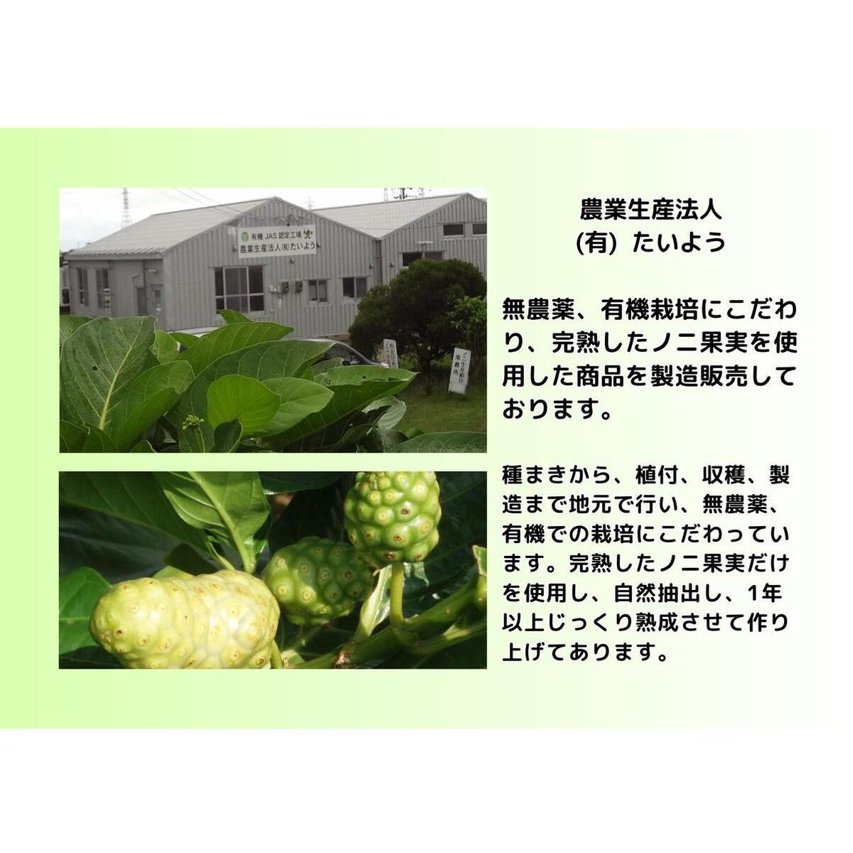 沖縄県うるま市の、うるまノニ生産組合(組合員約60名)の農家が、愛情いっぱいに育てたノニだけを使用し製造した