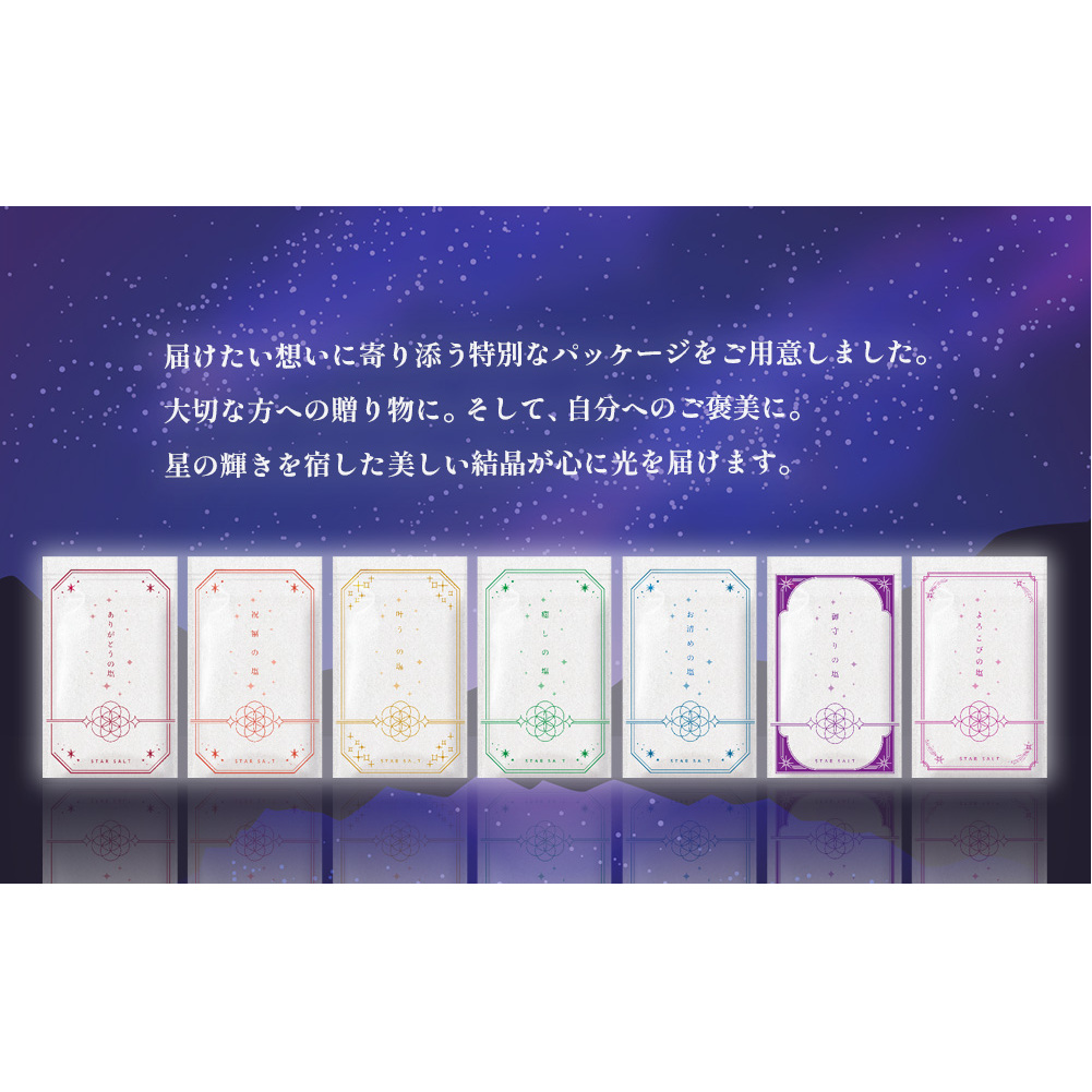 ※こちらの商品はご希望の3種をご自由にお選びいただけます。ありがとうの塩・祝福の塩・叶う の塩・癒しの塩・お清めの塩・御守りの塩・よろこびの塩からご希望3種を「備考欄」へご記入下さい。