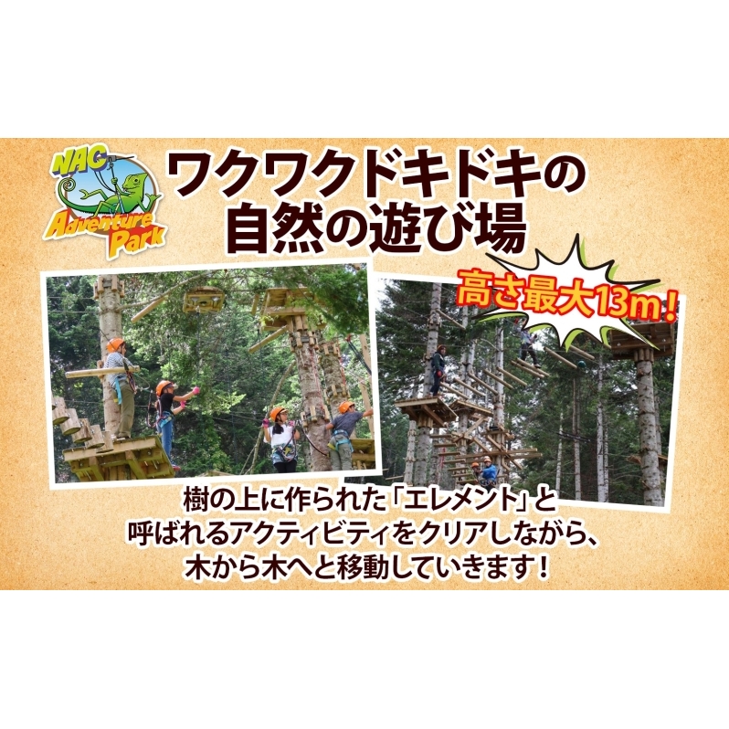 様々なアトラクションを体験できるNACアドベンチャーパークの「大人1日券」2枚です!