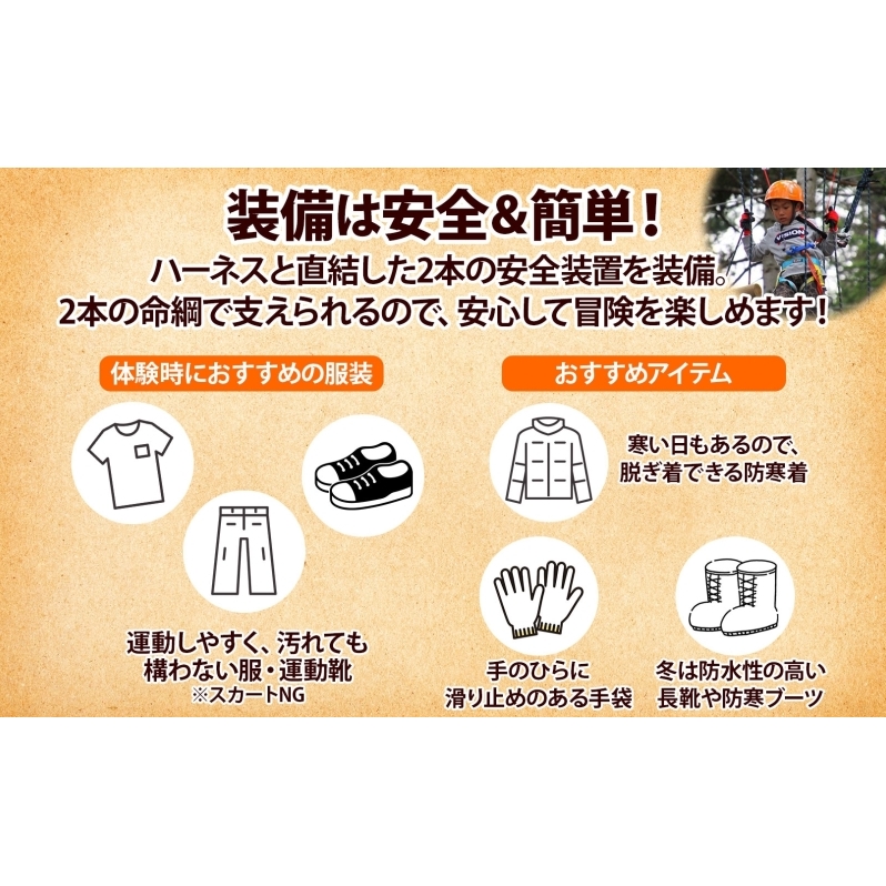 キッズ向けに高さが低いコースもあるので、高所が苦手な方や小さいお子様でも楽しめます!