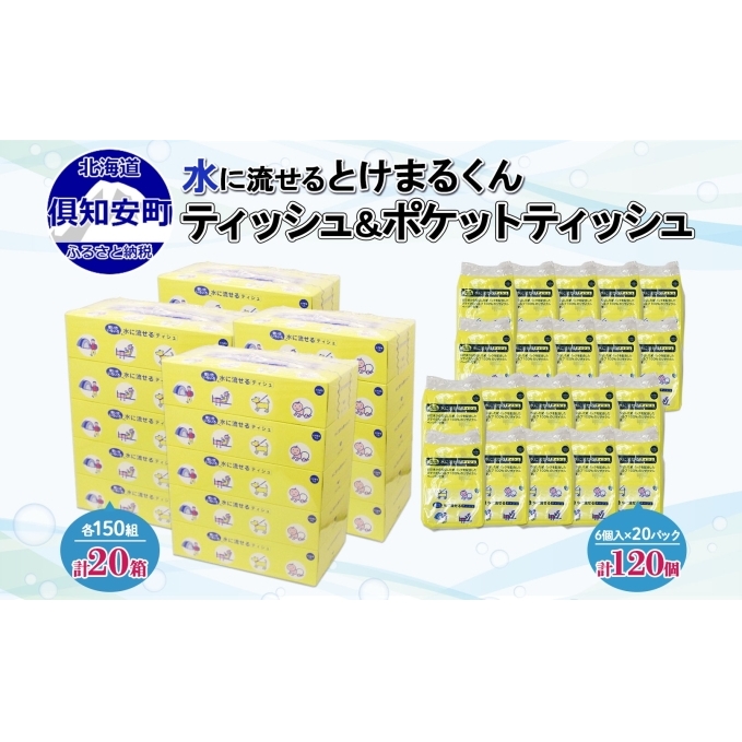 水に流せるとけまるくん ティッシュペーパー20箱&ポケットティッシュ120個をセットにしてお届けします。
