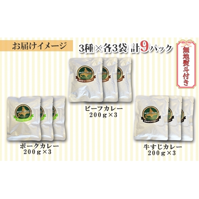 《無地熨斗対応》北海道 倶知安町の味覚がぎゅっと詰まった、こだわりのカレー3種(ビーフ・ポーク・牛すじ)の計9個セットです。