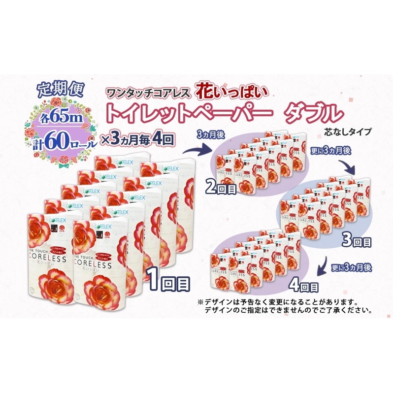 北海道 定期便 3ヵ月毎 全4回 ワンタッチコアレス 花いっぱい トイレットペーパー ダブル 65m巻 60ロール 芯なし 花柄 プリント ハーブ 香り付き ペーパー 防災 常備品 日用品 消耗品 備蓄 送料無料 倶知安町