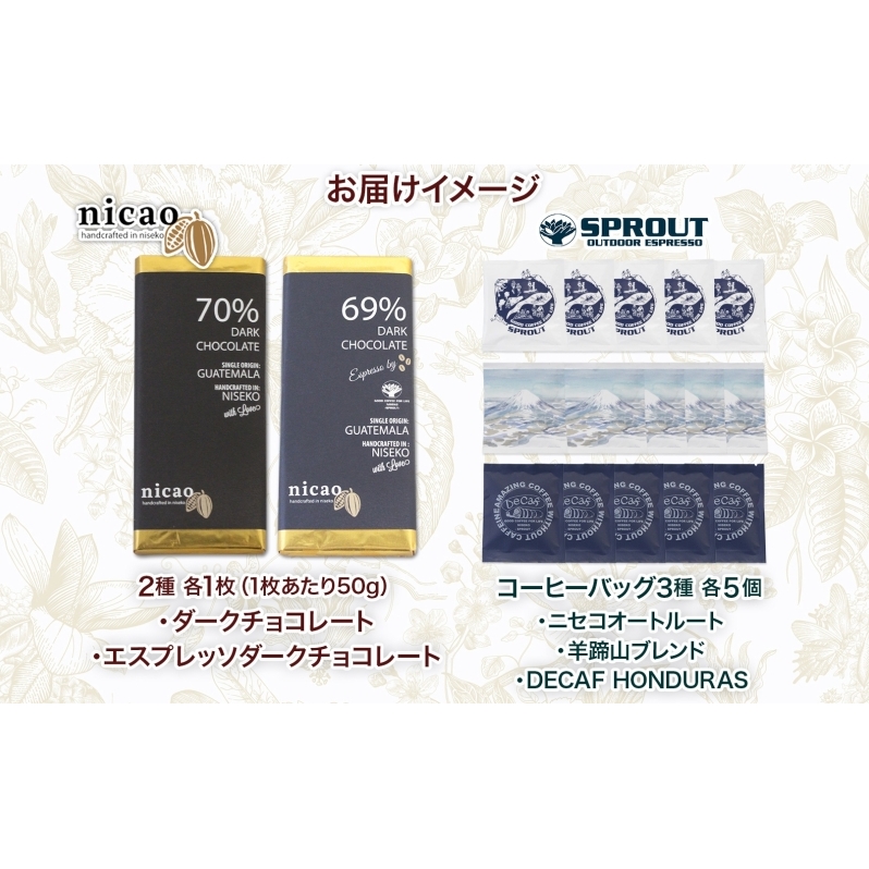 ニセコ初のビーン・トゥ・バー・チョコレート「ダーク&エスプレッソダーク」と、ロースタリーカフェ SPROUTの「ドリップバッグ3種」のセットです!